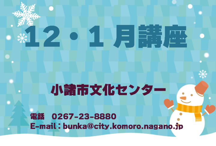 小諸市文化センター講座12.1月 年末年始子ども講座書初め教室 【文化センター講座2026-1】脳トレ・健康麻雀 【文化センター講座2026-1】プロの料理人に学ぶ 家庭でできる和・洋・中 【文化センター講座2026-1】着物リメイク講座 更新日:2025年11月20日