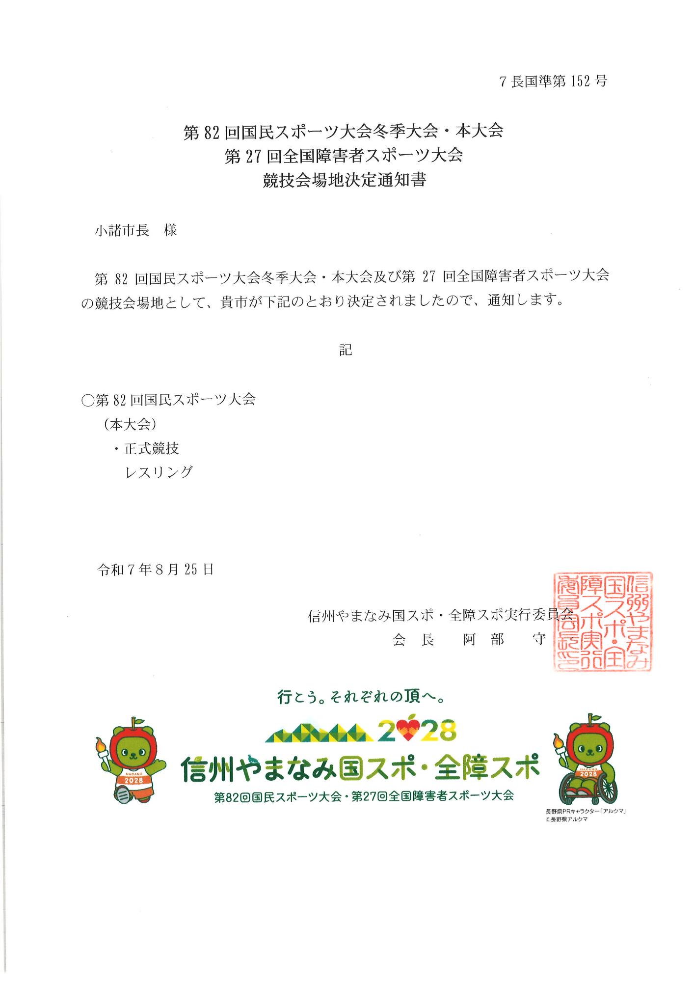 令和7年7月16日開催の公益財団法人日本スポーツ協会理事会において、令和10年度(2028年)の第82回国民スポーツ大会の開催地として長野県が決定され、これに伴い、小諸市が第82回国民スポーツ大会競技会場地として決定されました。